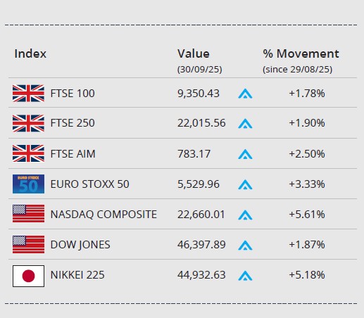 At the end of September, global markets delivered largely positive performances, with equities across major regions advancing and safe-haven assets strengthening. Gains were seen in UK, US, European and Japanese indices, while gold surged and oil prices stalled amid geopolitical tensions.